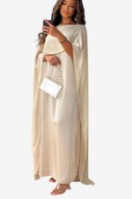 This women’s long sleeve maxi dress features a floor-length silhouette with soft draping that creates a continuous visual line. The loosely structured fit and smooth surface texture are designed for settings such as evening gatherings or formal events. Intended for wearers who prefer full coverage with balanced proportions, this design complements a range of accessories and styling options.