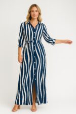 This women’s short-sleeve maxi shirt dress in light blue features a loose fit and versatile structure suitable for casual outings, vacations, or summer events.